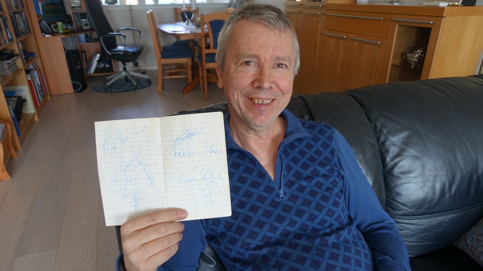 Da ble jeg jaggu sluppet inn og der var det jo stinn brakke. Noen i dusjen, noen holdt på tørke seg etter dusj og andre var ferdig kledd. De snakket jo engelsk så skjønte ikke så mye av hva de sa, men jeg spurte pent om autografer og alle var høflig og skrev i boken, inkludert manager Bertie Mee. Den boken har jeg enda. Glemmer det aldri.